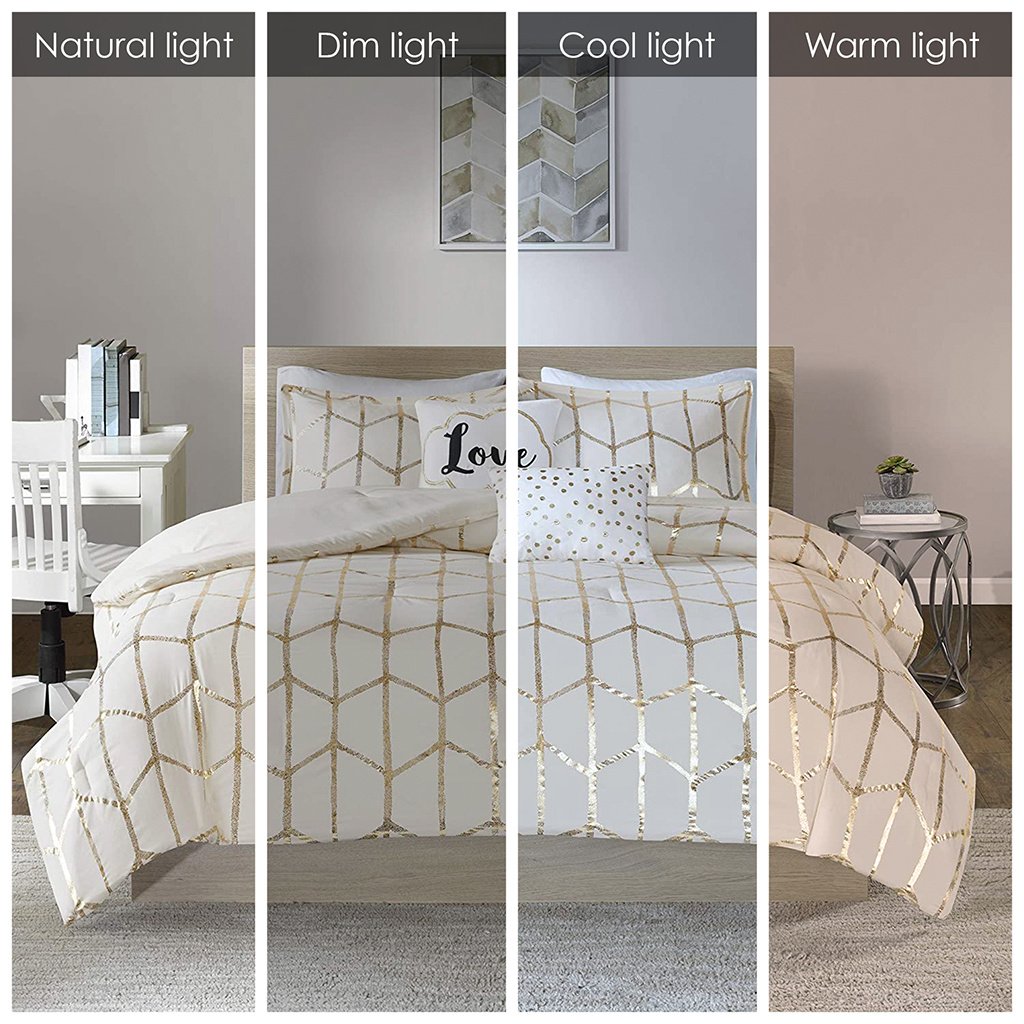DescriptionFreshen up your bedroom with the enchanting style of Intelligent Design's Raina Metallic Printed Duvet Cover Set. The stunning duvet cover flaunts a geometric, metallic gold print against a soft ivory ground for a fun and eye-catching look! Matching sham(s) echo the design seen on top of the bed to pull the entire ensemble together. Two embroidered decorative pillows with typography and metallic details complete this fabulous, ultra-soft microfiber duvet cover set. This bedding set uses an antimicrobial treatment that provides built-in freshness protection, reducing the growth of odor causing bacteria to keep fabric lasting longer. Button closures allow you to place a comforter insert within the duvet cover and internal corner ties prevent it from shifting.Product DetailsFull/Queen1 Duvet Cover:88"W x 90"L2 Standard Shams:20"W x 26"L + 1"D (2)1 Decorative Pillow:12"W x 16"L1 Decorative Pillow:16"W x 16"LMaterialDuvet Cover/Sham: 100% polyester brushed microfiber, with silver metallic print on the face, solid microfiber reverse, Pillow: polyester cover and polyester filling. Button enclosure. With 4 corner ties inside.